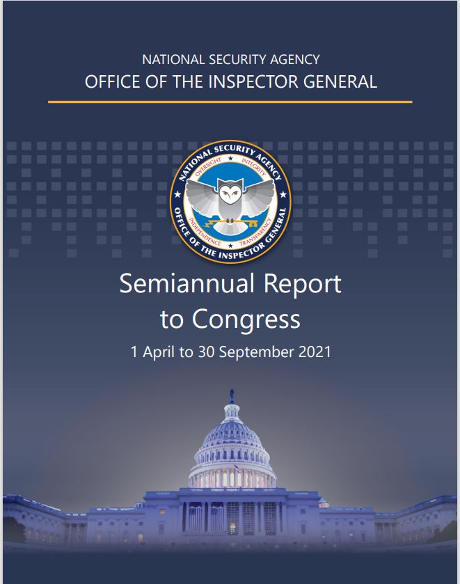 The unclassified version of the SAR covers the period from April 1, 2021 through September 31, 2021, and reflects what the NSA OIG could release publicly about its work for that SAR Report Cover reporting period. The OIG made 469 recommendations that we believe will be impactful in improving the economy, efficiency, and effectiveness of this critical Agency's operations. NSA's management agreed with all OIG recommendations that were made during the reporting period. The Director of the NSA and Congress previously received the classified version of the SAR in accordance with the IG Act. Click here to view.