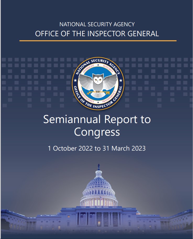 The SAR covers the period from 1 October 2022 – 31 March 2023, and reflects what the NSA OIG could release publicly about its work for that SAR Report Cover reporting period. The OIG made seven recommendations that we believe will be impactful in improving the economy, efficiency, and effectiveness of this critical Agency's operations. The Director of the NSA and Congress previously received the classified version of the SAR in accordance with the IG Act.